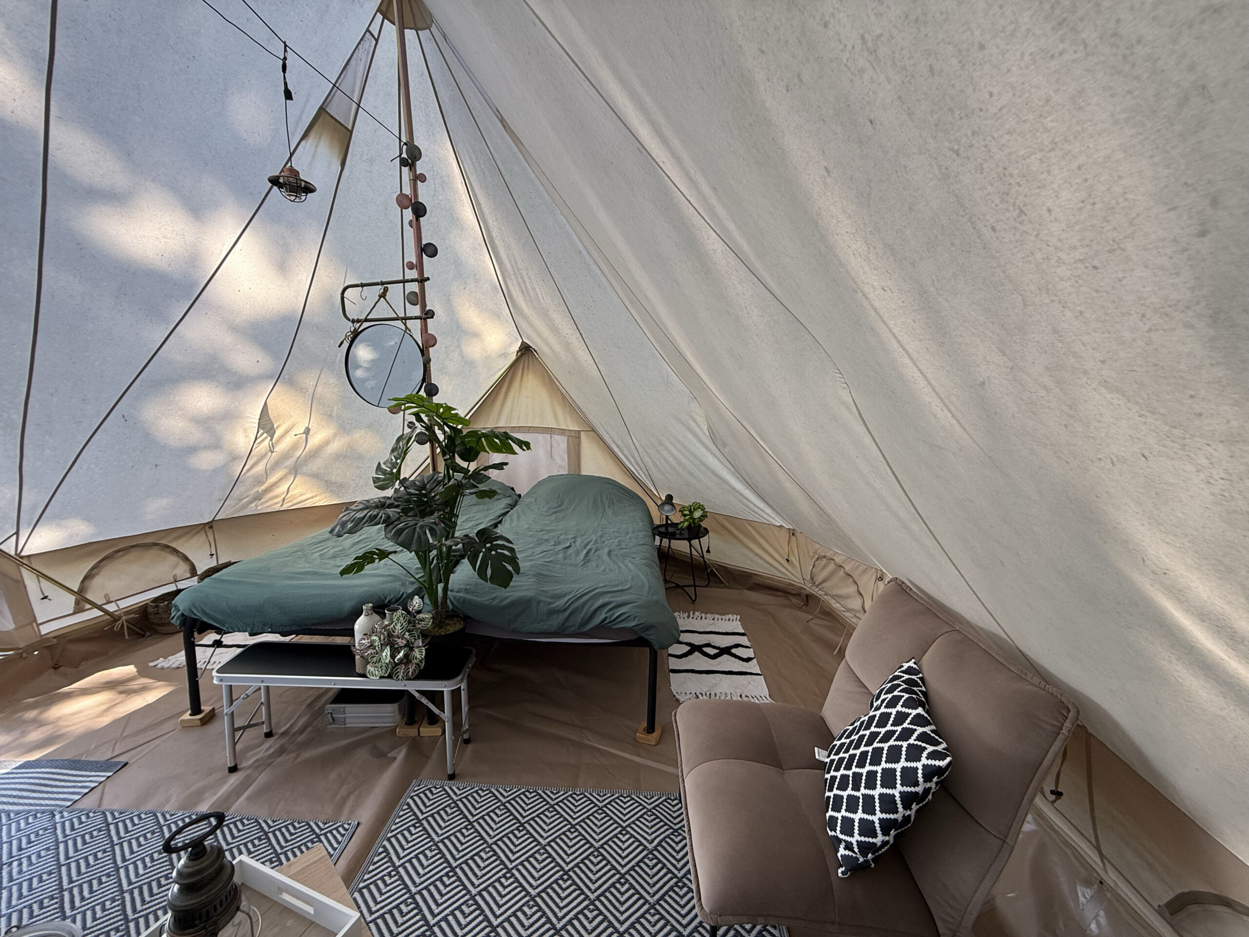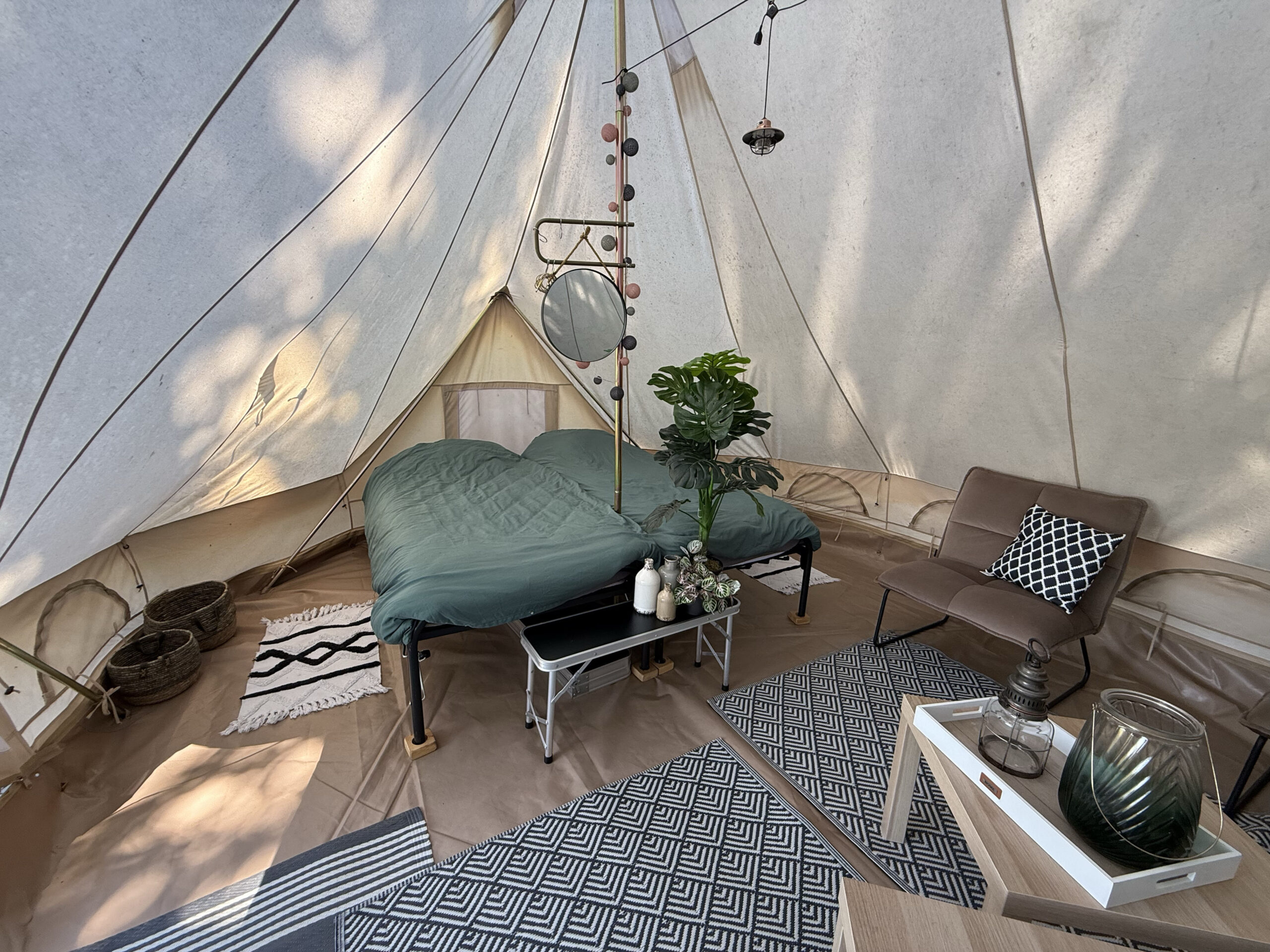 De Glamping is wordt verder ingericht met heeft 2 één persoonsbedden, een  2 pers. slaapbank, een gezellig zitje, koelkastje, koffie en thee hoekje, ventilator en voor de koude dagen een petroleum kachel. In de volledig in gerichte bijbehorende keukentent vindt u een koelkastje, koffiezet apparaat/senseo en alles wat u nodig heeft om met uw ingrediënten een lekkere maaltijd  te bereiden. Wanneer u geen zin in heeft om zelf te koken is het ook mogelijk om een maaltijd bij ons te bestellen.