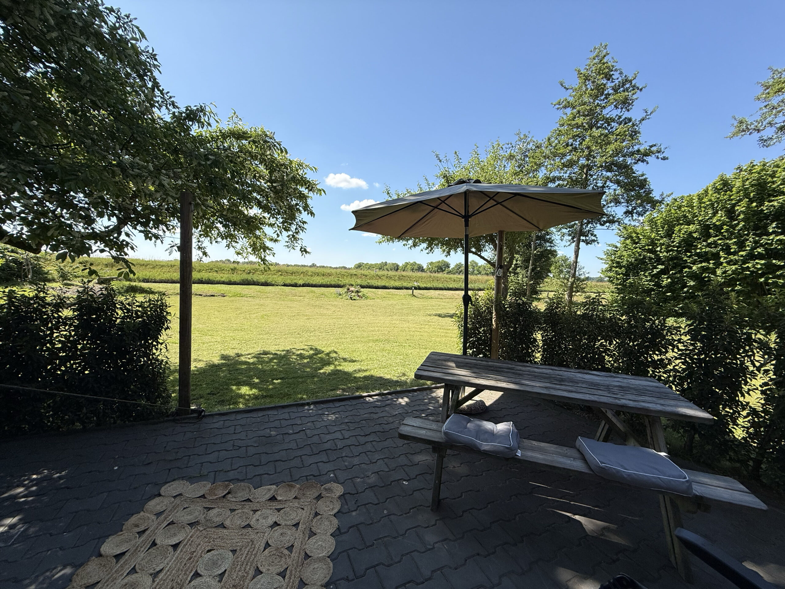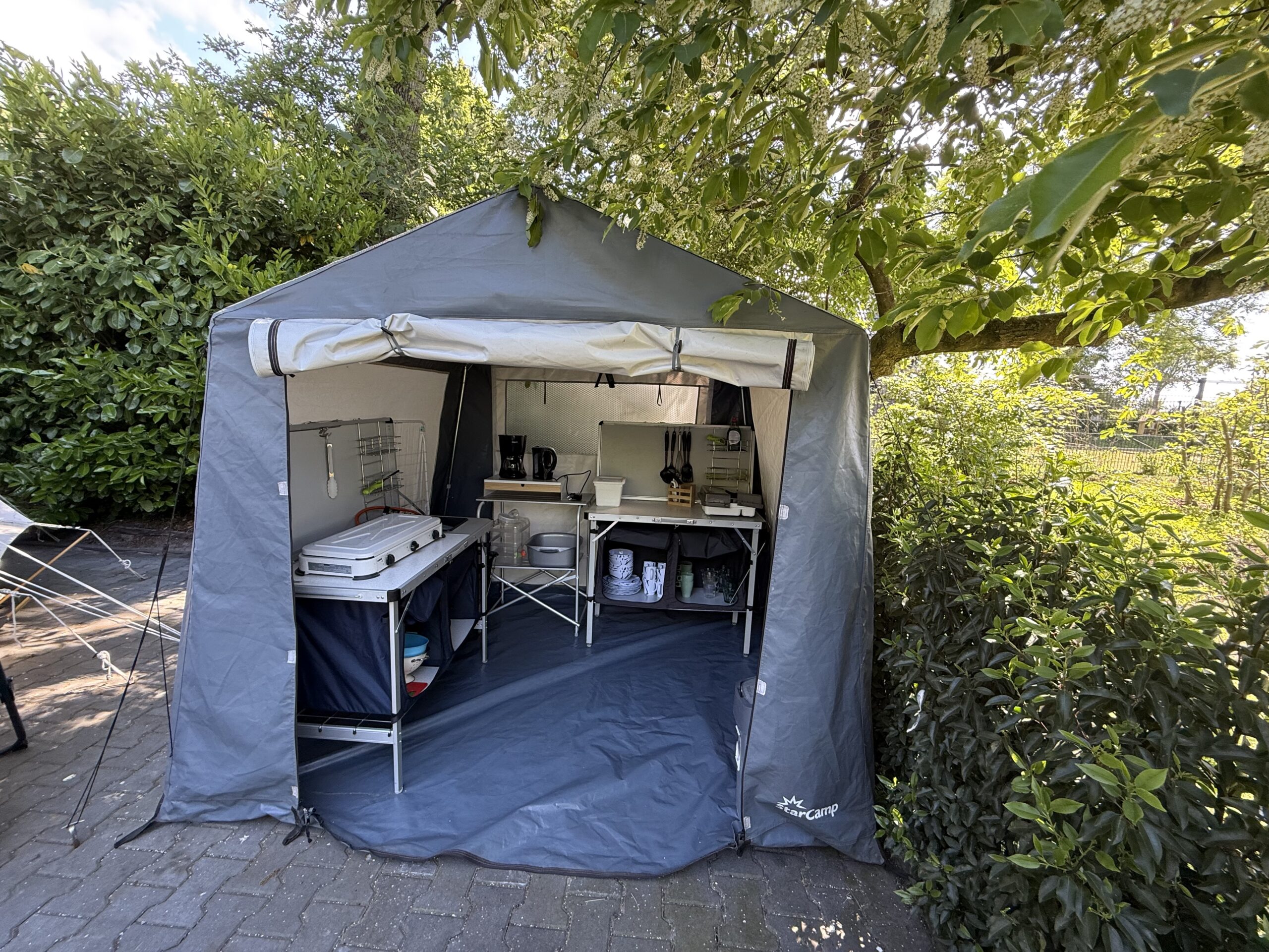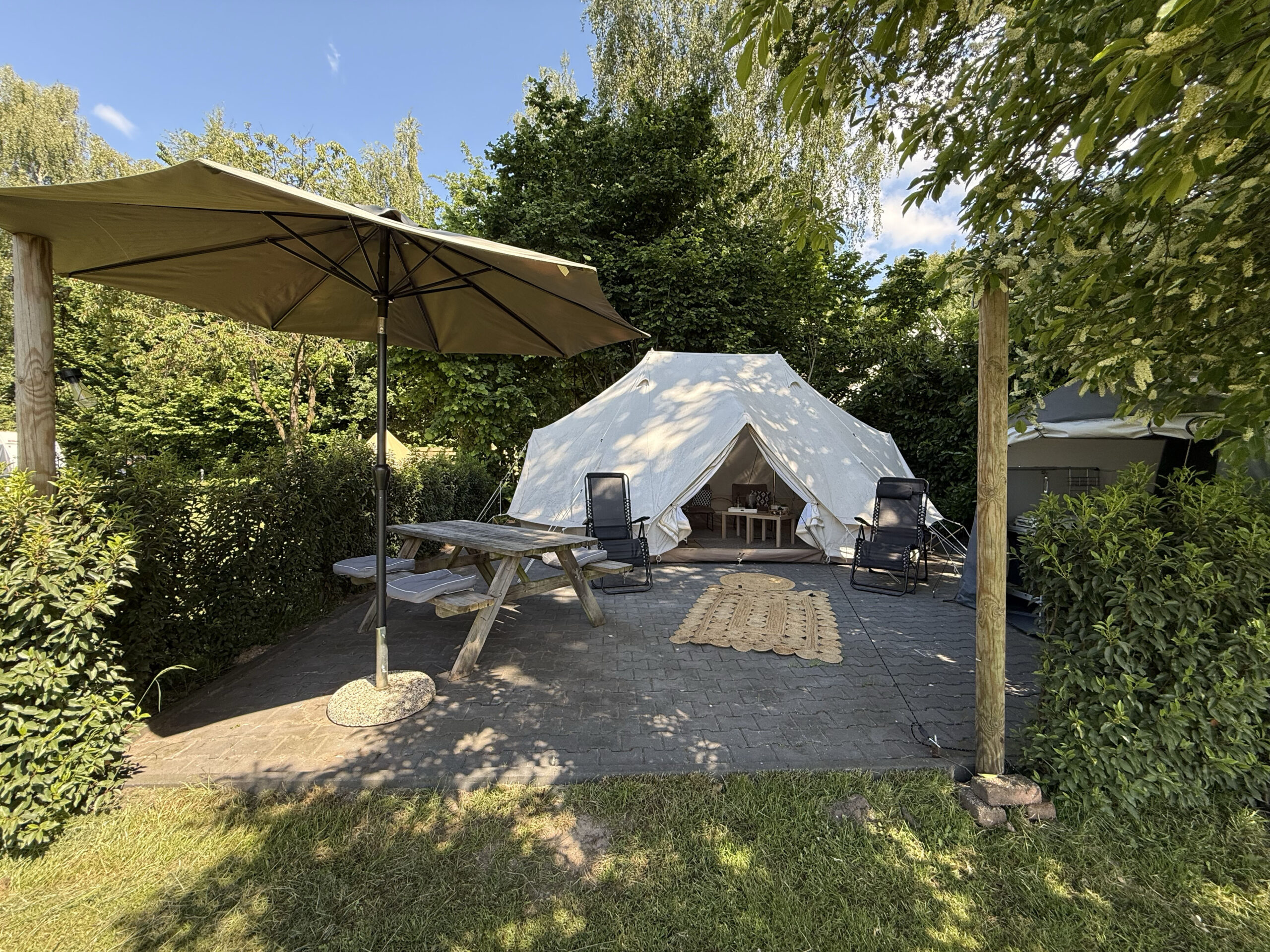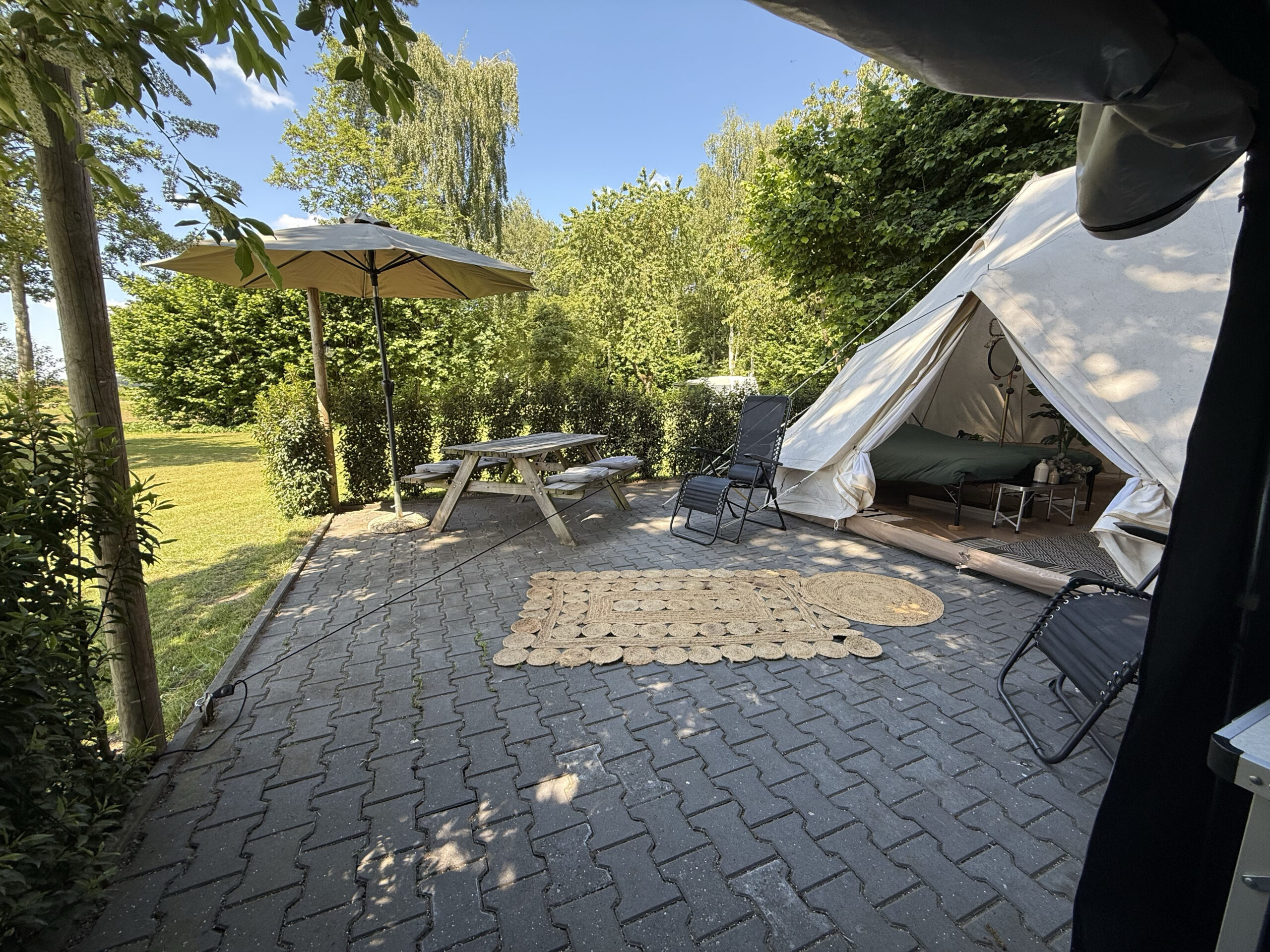 Voor de tent heeft een picknicktafel met een parasol om heerlijk uw ontbijt, lunch of avondmaaltijd in de buitenlucht te nuttigen.